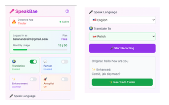 SpeakBae é uma extensão do Chrome projetada para facilitar a comunicação em aplicativos de namoro e chat. Com uma tecnologia de ditado por voz, o software permite que os usuários enviem mensagens de forma rápida e prática, eliminando a necessidade de digitar. Ele é compatível com plataformas populares como Tinder, Candy AI e Discord, além de outros cinco aplicativos, proporcionando uma experiência fluida e acessível para quem busca interagir através da voz.